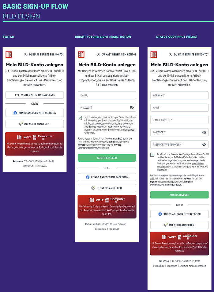 Sign-Up & Login Flows für BILD.de und WELT.de – Product Design, Testing, Optimization. Whitelabel-Lösung für Publikationen, Brands und Partner der Axel Springer SE.