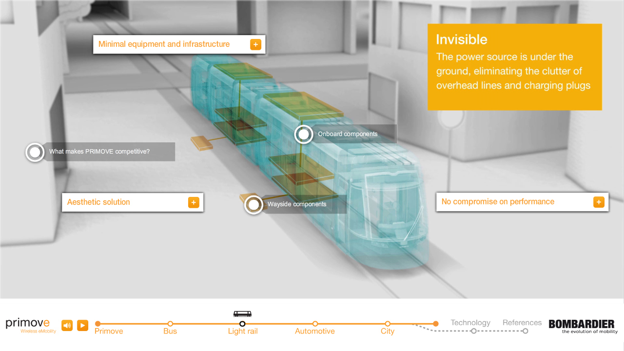 Für Bombardiers innovative PRIMOVE-Technologie – ein berührungsloses Ladesystem für Elektrofahrzeuge – gestaltete ich als Lead Designer in einem kleinen Team eine Messe-App, die sowohl auf fest installierten Bildschirmen als auch auf ausliegenden iPads zum Einsatz kam.