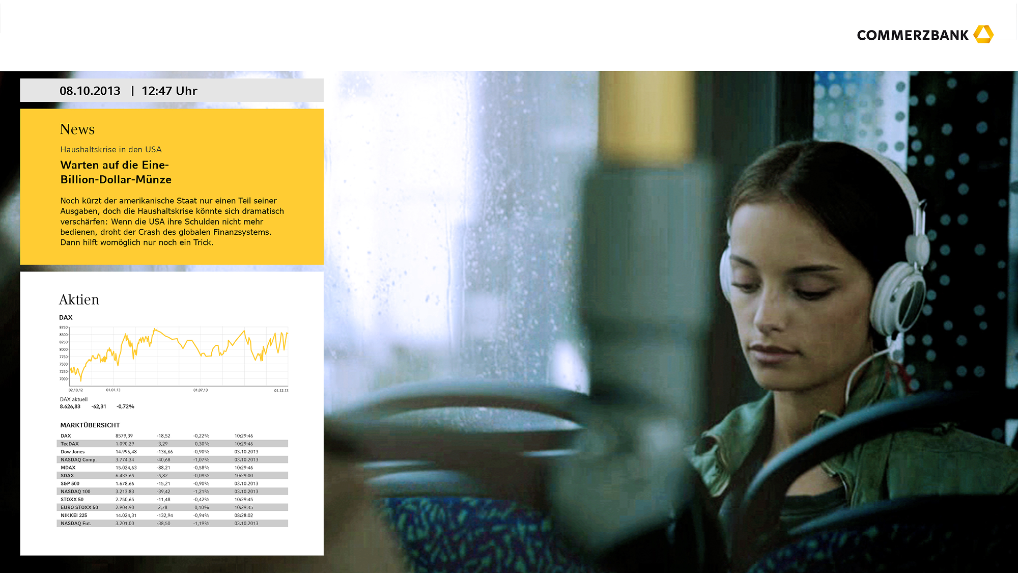 Besonders atmosphärisch: Als Hintergrund laufen stimmungsvolle Image- und Mood-Videos aus der übergreifenden Werbekampagne der Commerzbank, die dem Informationssystem einen emotionalen Kontext geben und gleichzeitig die Markenwelt erlebbar machen. Die Gestaltung balanciert zwischen Informationsgehalt und Atmosphäre.