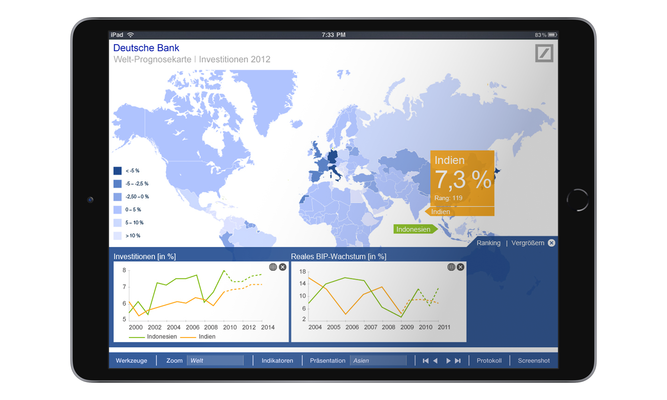 Für die Deutsche Bank übernahm ich das Design einer iPad-App, die speziell für den Einsatz in der Kundenberatung entwickelt wurde. Die Anwendung sollte Berater dabei unterstützen, Finanzprodukte und -dienstleistungen anschaulich und professionell zu präsentieren.