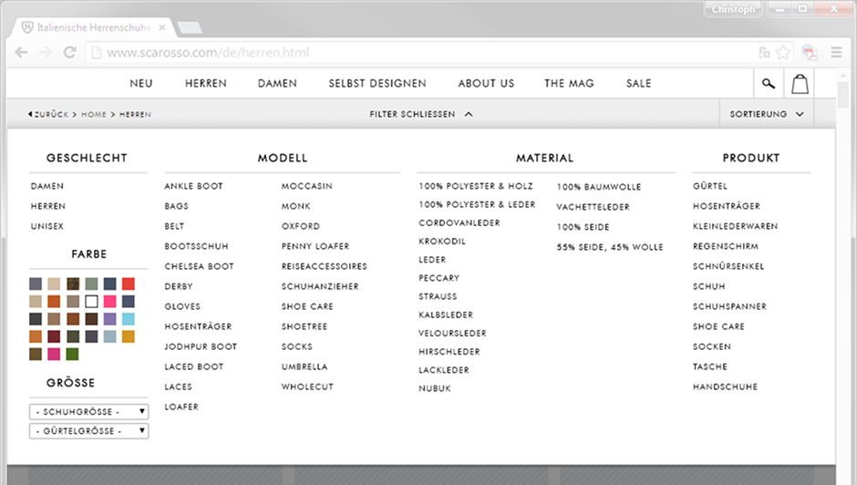 2015 war ich als UX Designer bei Scarosso für die Weiterentwicklung der E-Commerce-Plattform des italienischen Modelabels verantwortlich. In klassischer Startup-Mentalität übernahm ich neben dem Design auch wesentliche Produktmanagement-Aufgaben.