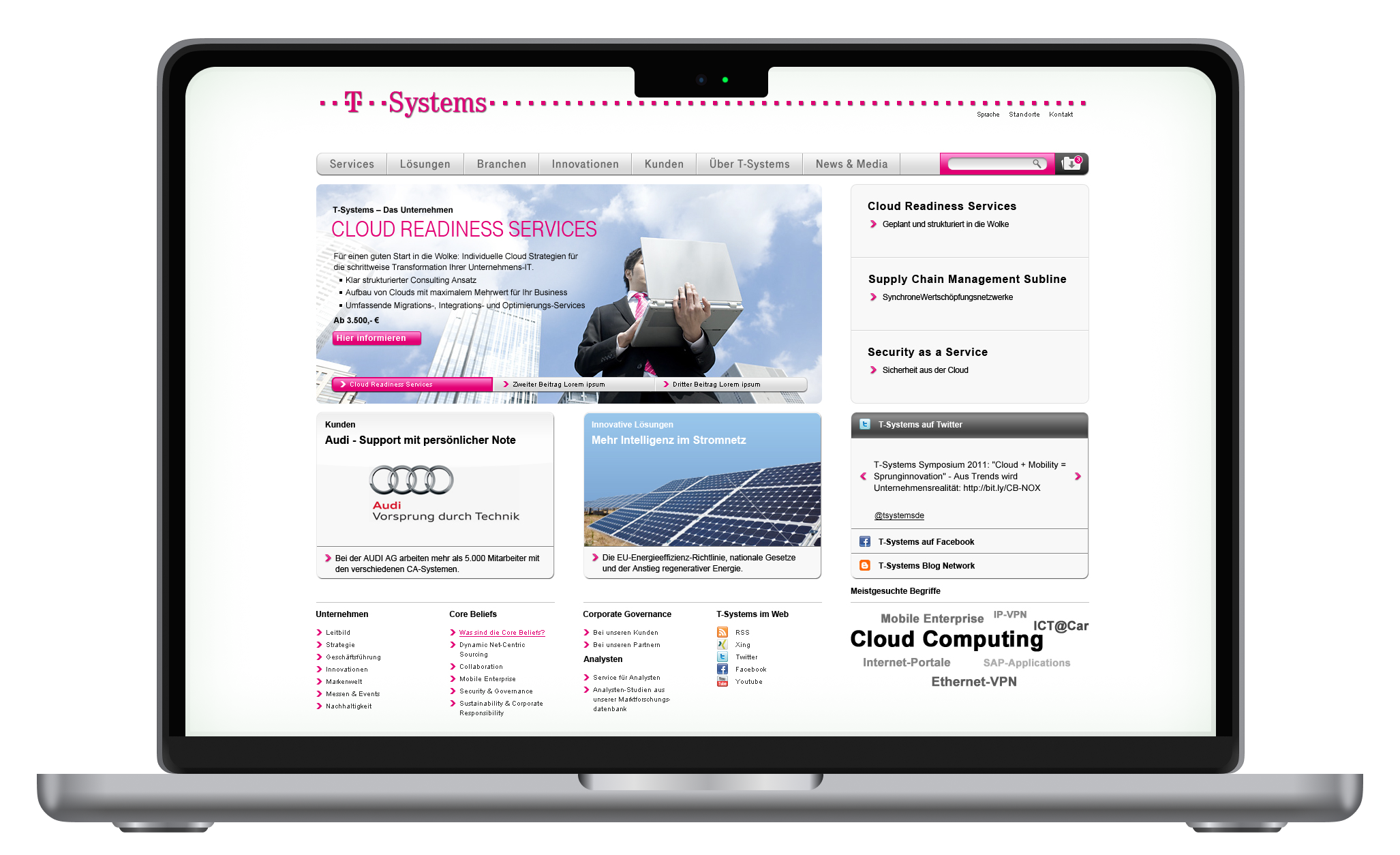 2013 übernahm ich den Design Lead für den Relaunch der T-Systems Corporate Website. In enger Zusammenarbeit mit dem internen Branding-Team von Telekom und T-Systems entwickelten wir einen Styleguide, der die Grundlage für den gesamten digitalen Auftritt bildete.